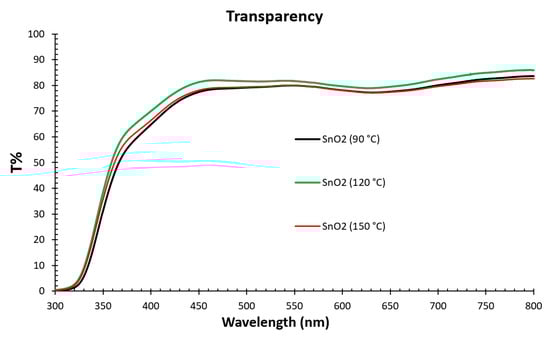 The transparency of SnO2 film annealed at 90C, 120C, and 150C as a function of wavelengths.