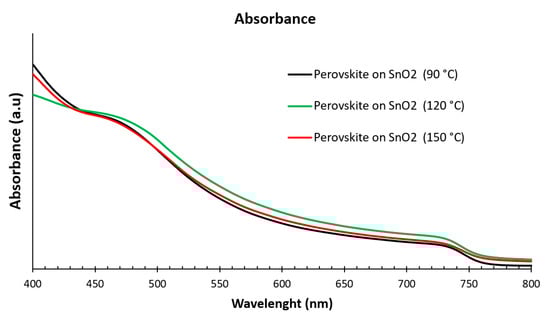 The optical absorption spectra of perovskite films deposited on SnO2 film annealed at 90 C, 120 C, and 150 C.
