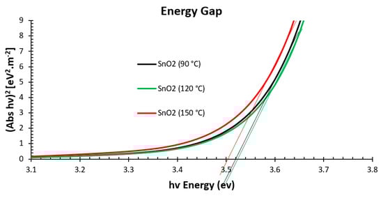 Figure 6 displays the absorbance edge of the SnO2 annealed with different temperatures. This figure also shows (Abs hυ)2 against hυ (in eV) found from the transmission spectra [35]. The Eg bandgap of SnO2 annealed at 120 °C or 90 °C obtained from the Tauc plot was 3.52 eV, while the Eg was 3.5 eV for SnO2 annealed at 150 °C. A wider Eg offers better hole-blocking ability and can reduce high-energy photon losses, resulting in lower photogenerated carrier losses [36].