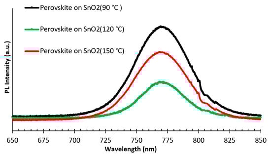 To study the defect and charge extraction characteristics of perovskite deposited on SnO2 annealed at different temperatures, photoluminescence (PL) measurements of these different perovskite films deposited on SnO2 were analyzed. Perovskite films deposited on SnO2 annealed at 120 °C showed quenching of the perovskite emission peak at 770 nm. Figure 7 displays the PL spectra of perovskite active layers deposited on SnO2 annealed at 90 °C, 120 °C, and 150C. From the PL spectra of perovskite deposited on SnO2 annealed at 90C, it can be observed that a much stronger PL intensity peak results from high recombination rates in these films. When applying the perovskite active layer on an SnO2 film annealed at 120 °C, the PL spectra peak exhibits notable quenching, indicating effective electron extraction of the ETL and a fast charge transfer. This might be attributed to a comparatively low oxygen vacancy defect density present in the ETL prepared under these conditions [21].