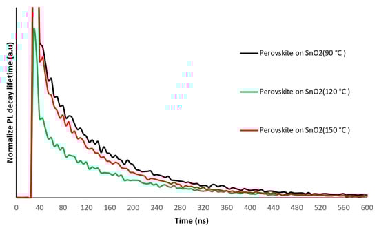 Figure 8 shows the PL decay lifetime of perovskite deposited on SnO2 annealed at different temperatures. It can be seen that the PL decay lifetime of perovskite deposited on SnO2 annealed at 120 °C was 160 ns, while the lifetimes of perovskite deposited on SnO2 annealed at 90C or 150C were 112 ns and 125.5 ns, respectively. The longer carrier lifetime promotes the extraction and transfer of electrons from the perovskite active layer to the ETL before recombination occurs. This is consistent with the PL results [37].