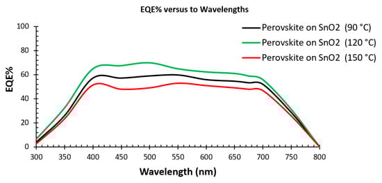 Figure 9 illustrates the external quantum efficiency (EQE) spectra of perovskite deposited on SnO2 annealed at 90 °C, 120 °C, and 150 °C. It is found that perovskite deposited on SnO2 annealed at 120 °C has larger EQE values at the wavelength range between 300 nm and 800 nm, leading to a higher current density when the device is tested under sunlight conditions. The EQE graphs for perovskite deposited on SnO2 annealed at different temperatures exhibited a continued photocurrent generation at wavelengths between 300 and 800 nm and fall outside this wavelength range. The EQE data followed the PL response measurements, indicating that a low PL peak offers larger EQE values [21].