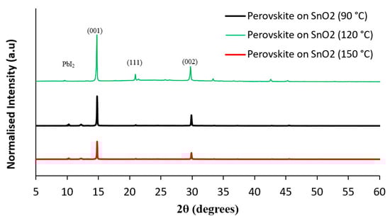 XRD measurements were performed to investigate the effect of changing annealing temperatures of the SnO2 films on the surface quality, crystallinity, and phase structure of the perovskite active layer. It can be seen from Figure 10 that the XRD intensity of the (001) plane of the perovskite deposited on SnO2 annealed at 120 °C is higher than the perovskite deposited on SnO2 annealed at 90 °C and 150 °C. This indicates improved crystallinity of the perovskite active layer with a “high absorption in the short wavelength region” [31]. These results are consistent with the PL spectra results. Our results exhibited a decrease in the PbI2 peak intensity for perovskite devices deposited on SnO2 annealed at 120 °C compared to other devices deposited on SnO2 annealed at 90 °C and 150 °C. This led to a decrease in the hysteresis phenomenon when devices are subjected to current–voltage measurement under sunlight and improved the efficiency of the PSC devices [38].