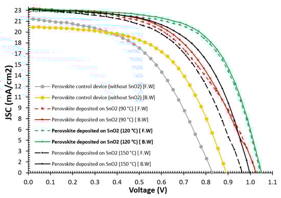 The annealing temperature of SnO2 was changed from 90C to 150C to achieve the optimum annealing temperature that produced the best device efficiency. Device reproducibility is important for PSC performance with the aim of achieving the highest PCE [39]. Ten samples were fabricated using SnO2 in each experimental run to ensure reproducibility. Table 1 shows key parameters of the perovskite devices (average of 10 samples) deposited on SnO2 at different annealing temperatures. It is demonstrated from the J-V characteristic curves in Figure 11 that perovskite devices deposited on SnO2 annealed at 120 °C yielded the highest average efficiency of 15% based on an active area of 0.36 cm2. The device efficiency improvements are due to the increased perovskite grain size and the decreased recombination rates in the active perovskite layer. The hysteresis index (H.I) was calculated using Formula (1). The hysteresis phenomenon is caused by “charge accumulation, ion migration, trap-assisted charge recombination, and charge redistribution when the voltage is swept forward and backward [40,41,42]. The average PCE of the control sample without SnO2 was 9.4% with an H.I of 14.9%. The drop in efficiency of the control sample is attributed to decreased charge extraction, increased Rs, and charge recombination [7]. The H.I for perovskite devices deposited on SnO2 annealed at 120 °C was less than that used at other annealing temperatures. The perovskite deposited on SnO2 annealed at 120 °C produced around 16% higher efficiency than the PSCs deposited on SnO2 annealed at 90 °C or 150 °C. It is indicated from Table 1 that the open circuit voltage (Voc) of the perovskite deposited on SnO2 annealed at 120 °C is 1034 mV, while the average open circuit voltages of other perovskite devices deposited on SnO2 annealed at 90 °C and 150 °C were 1026 mV and 982 mV, respectively. The fill factor (FF) of the perovskite deposited on SnO2 annealed at 120 °C was 60.8%, while the average FFs of other perovskite devices deposited on SnO2 annealed at 90 °C and 150 °C were 51.8% and 55%, respectively. These improvements of perovskite devices deposited on SnO2 annealed at 120 °C are attributed to the decrease in the Rs from 11.25 to 7.7 Ω·cm2. This was also the reason for the increased current density of 22.65 mA/cm2.