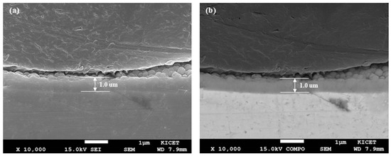 Cross-sectional SEM images of TiN coating: (a) SEI image; (b) COMPO image.