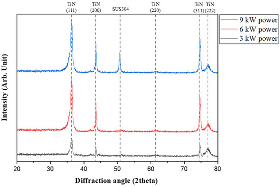 In Figure 1, the coating thickness was confirmed to be 1 μm through microstructure analysis to fix the variable of coating thickness before measuring internal stress using HR-XRD. Since variations in coating thickness can lead to changes in internal stress, making it difficult to accurately evaluate the measurement method, the X-ray power was adjusted to vary the analysis range. Tests were conducted on the same specimen by adjusting the X-ray power of HR-XRD to 3 kW, 6 kW, and 9 kW, focusing on the (111) plane, which is the preferred growth orientation of TiN.