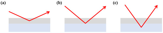 To evaluate internal stress based on surface roughness, specimens were prepared with the same coating thickness, and the surface roughness was adjusted through polishing after the deposition process. The surface roughness was adjusted to 0.01 Sa, 0.02 Sa, and 0.03 Sa, and the images showing the surface roughness are shown in Figure 4. The X-ray power was set to 9 kW to cover the entire coating layer, and the internal stress was analyzed in a stress mode, focusing on the (111) plane. The gradient of diagram was found to be constant for all three specimens, confirming that the method is valid for coating specimens with a surface roughness of 0.03 Sa or less. In general, considering that the surface roughness of titanium-based nitride coatings deposited by sputtering is 0.02 Sa or less, the test method for internal stress using HR-XRD is suitable.