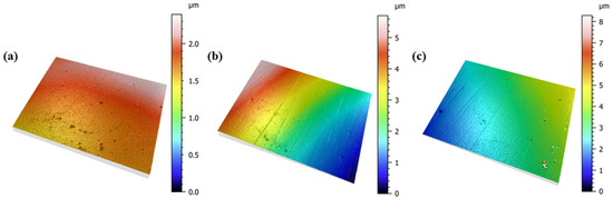 Surface roughness of TiN coatings as determined by confocal microscope: (a) 0.01 Sa; (b) 0.02 Sa; (c) 0.03 Sa.