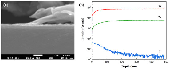 (a) Cross-sectional SEM images of carbon-doped TiZrN coating; (b) ToF-SIMS depth profiles of carbon-doped TiZrN coating.