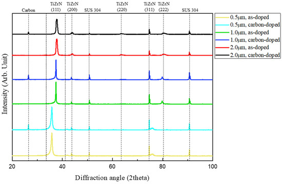 HR-XRD patterns of as-doped and carbon-doped TiZrN coatings by coating thickness.