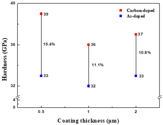 Figure 7 shows the changes in hardness before and after carbon doping depending on the ratio of the carbon gradient layer measured by a nanoindenter. For all coating thicknesses, the hardness before carbon doping was similar, but as the ratio of the carbon gradient layer increased, the difference in hardness changes emerged. The hardness increases at 0.5 μm, 1 μm, and 2 μm thicknesses were 15.4%, 11.1%, and 10.8%, respectively. It was confirmed that the hardness was improved the most from 33 GPa to 39 GPa at the thickness of 0.5 μm, where the ratio of the carbon gradient layer was the highest. This improvement can likely be attributed to the enhanced mechanical properties resulting from increased internal stress. Previous research has been conducted on titanium nitride coatings with carbon, and the results of this research show similar or better property improvements compared to previous research [19,20,21].