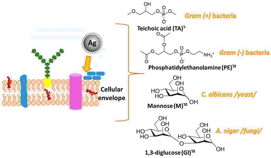 It is known that AgNPs/Ag+ exert therapeutic effect by (1) denaturing/inactivating cellular proteins and enzymes, (2) increasing the concentration of reactive oxygen species (ROS), and (3) forming inactive structures when electrostatically interacting with the complementary bases of the DNA double helix. [51]. The Density Functional Theory approach presented in the current study is encoded in the Gaussian 09 Suite of Programs [52] to assess another possible mechanism of silver’s antifungal/antibacterial activity focused on its interaction with the outer envelope of the microorganism cells. AgNPs with smaller particle sizes possess a more significant antimicrobial effect assigned to increased available surface area per unit mass, which allows purely mechanical destruction of the cell wall/membrane, a higher release of Ag+, and facilitated interplay with other particles. The expulsed particles in the surrounding media cations are hypothesized to bind the constituents of the external envelope effectively. Hence, we modeled some of the most common constituents in the Gram (+) bacterial wall—teichoic acid (TA); in the Gram (-) outer membrane—phosphatidylethanolamine (PE), known to build about 75% of the membrane lipids in E. coli; models of the carbohydrate outer layers in Candida albicans known as mannan [53], with reduced structure to mannose; and in A. spp.—1,3—β-glucan, calculated as a 1,3-β-glucose dimer [54]. These models are presented in the following Figure 2.