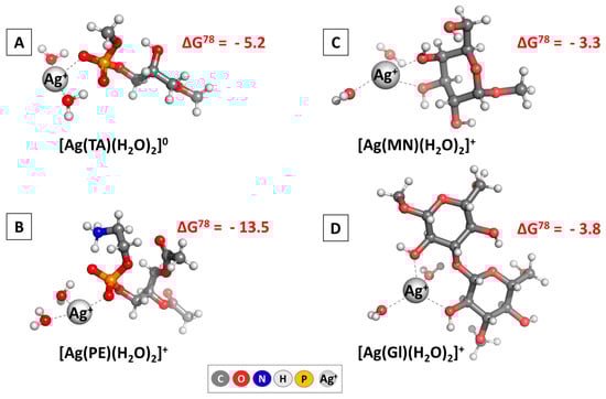The broadly implemented DFT methodology indicated that it is indeed thermodynamically justified for the silver cations to interact with some main constituents, building the outer layer of the microorganisms’ cellular envelope. The results are presented in Figure 3 regarding the change in the Gibbs energy (in kcal mol−1).