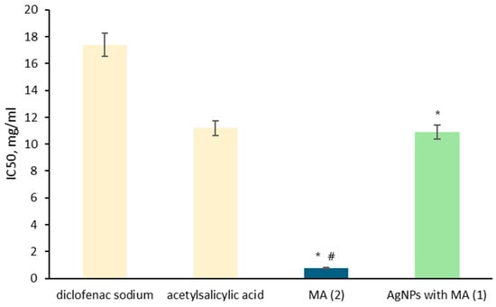 In our experiments, drug-loaded AgNPs (1) have similar protection to acetylsalicylic acid, about two times lower than diclofenac sodium and about 35 times lower than MA (2) (Figure 4). The obtained results confirmed the anti-inflammatory activity of MA, which was deposited on the AgNPs’ surface.