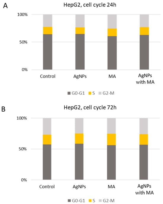 Cell cycle distribution of HepG2 cells treated with AgNPs, MA, and AgNPs with MA for 24 h (A) and 72 h (B). The percentage of cells in G0–G1 (dark grey), S (light grey), and G2–M (yellow) phases was determined via flow cytometry and subsequent data evaluation using FlowJo™ software (Version 10, Becton Dickinson, USA). The treatments were applied at concentrations corresponding to the IC50 values determined for each compound and time point: MA—24.69 µg/mL (24 h), 29.39 µg/mL (72 h); AgNPs—6.35 µg/mL (24 h), 17.79 µg/mL (72 h); AgNPs with MA—8.88 µg/mL (24 h), 13.93 µg/mL (72 h).