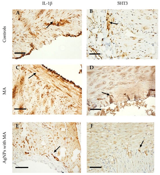 This study was performed on 5 μm sections of the stomach’s circular and longitudinal muscle layers. The sections were stained with IL-1β (E-AB-52153) and 5HT3 (1:300, E-AB-32268) antibodies (Elabscience Biotechnology Inc., Houston, TX, USA). Micrographs were taken with a Leica DM1000 LED and ICC50W camera. The intensity of the reaction was assessed in arbitrary units (0–256 AU) using DP–Soft 3.2 (Olympus, Tokyo, Japan), by analyzing a minimum of 50 measurement points per slice, from five representative slices obtained from a single animal, at 400× magnification.