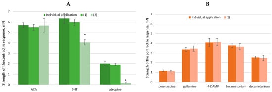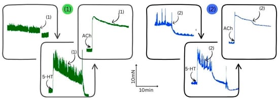 This study was performed on gastric smooth muscles (SMs) of male Wistar rats weighing 270–290 g. Three or four muscle strips were taken from a rat’s stomach. The number of muscle preparations used for each data point is indicated by n. The isolated SM preparation was placed upright in a thermostated vessel for isolated tissues 15 mL in volume and oxygenated with physiological fluid at a temperature of 37 °C. SM preparations of circular dissection, 12–13 mm in length and 1.0–1.1 mm in width, were used to record isometrically the contractile activity. All transducers used in our experiments were made by the Tissue Organ Bath System (159920 Radnoti, Dublin, Ireland) according to a previously described procedure [39,46,47]. The vitality of the SM tissues was tested by administering 10⁻6 M Acetylcholine (ACh) both at the beginning of the experiment and after each application of the substances being tested.