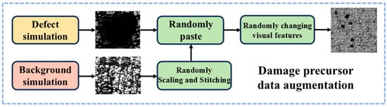 In this study, the training images were acquired by the acquisition system described in Section 2.1. We primarily collected two common types of damage precursor images: porosity and crack. The distribution of each category and precursor features is summarized in Table 1. In this study, the simulation of both the background and damage precursors in the images is based on the acquired precursor features. Taking porosity as an example, its simulation process is illustrated in Figure 2. For the background simulation of porosity precursors, we cropped regions without precursors from the collected data. For the porosity precursor simulation, 100 Gaussian functions with distinct variances and means were randomly generated within a grid. These functions were superimposed to create a randomly fluctuating matrix. Subsequently, the matrix was scaled to the range (0, 255), and its dimensions were randomly resized to simulate precursors of varying sizes. Finally, multiple coordinates were randomly generated within a grid to assign positions for the simulated precursors in the background.