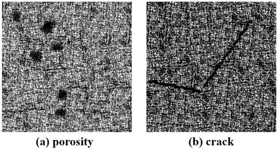 The simulation process for crack damage precursors follows a methodology similar to that of porosity, both based on the acquired image features for synthetic reconstruction. The final simulated images of porosity and crack damage precursors are illustrated in Figure 3.