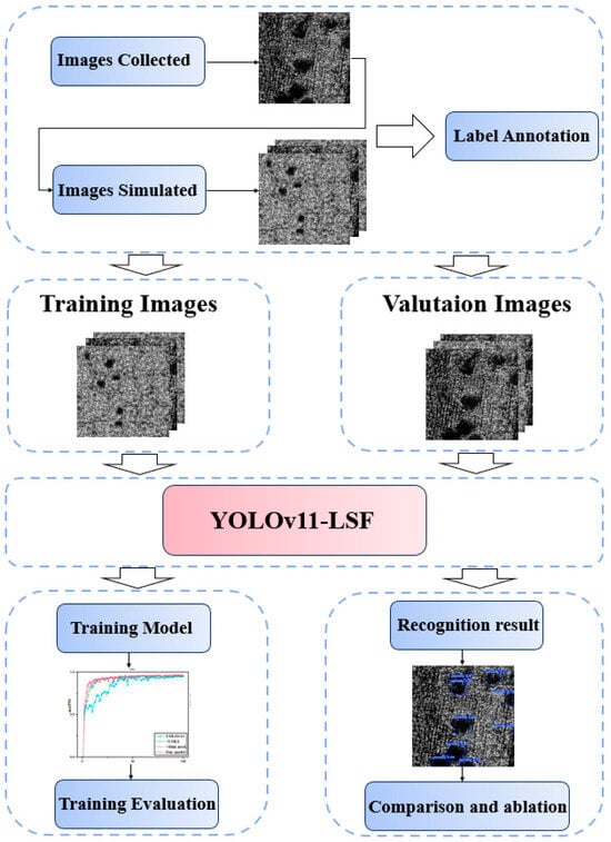 Figure 4 illustrates the experimental workflow of the proposed YOLOv11-LSF model, which comprises four stages: dataset acquisition, batch image processing, model training, and performance evaluation. First, damage precursor images on the surface of AM components are captured using the hardware acquisition system; synthetic data resembling the captured precursors are then generated through simulation based on their morphological features. Both raw and synthetic images are annotated using LabelImg, saved as TXT files, and combined to form the hybrid training dataset. In the model design phase, the YOLOv11-LSF model is developed to enhance inspection accuracy and efficiency by integrating the LSKA attention mechanism into the backbone, constructing a Slim-neck structure, and training with the hybrid dataset (technical details are discussed in Section 3). During evaluation, a unified test set is adopted to ensure fairness, with performance metrics including precision, recall, mean average precision, GFLOPs, and other critical parameters. Comparative analyses of different models are conducted to validate the effectiveness of the proposed damage precursor inspection framework.
