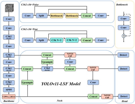 These challenges are particularly critical for our research because our objective is to develop an efficient and practical damage inspection system. Furthermore, while processing targets with significant scale variations, such as pores and scratches, the detection accuracy of YOLOv11 still needs improvement. This indicates that while YOLOv11 performs well in many aspects, more optimizations and adjustments are required for specific applications, such as AM damage precursor detection. This study proposes two improvements to the YOLOv11 network architecture. The enhanced architecture primarily comprises three components: the Backbone network, Neck network, and Head network, with its model structure illustrated in Figure 5. First, the LSKA attention mechanism is integrated into the backbone, which replaces the original C2PSA module with the C2PSA_LKSA module, to enhance multi-scale target detection capabilities and improve the model’s overall detection and classification performance. Second, considering that introducing attention mechanisms may increase model complexity, a lightweight grouped convolution based on the Slim-neck concept is adopted to construct the VoV-GSCSP module, which enables the efficient fusion of feature maps across different stages. This achieves reduced computational complexity without sacrificing accuracy.