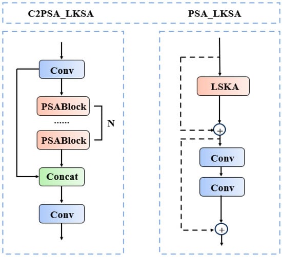 In this study, we introduce the LSKA attention mechanism into the backbone and propose the C2PSA_LKSA module, which enhances the model’s capability to detect multi-scale targets and focus on key regions without introducing excessive parameters. The structure of the C2PSA_LKSA module is illustrated in Figure 6.