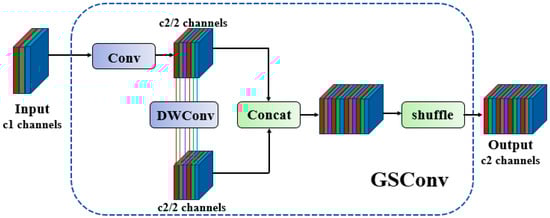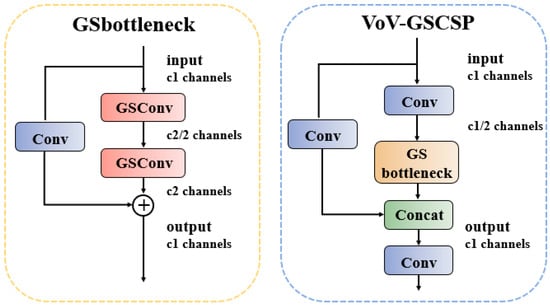 Figure 7 illustrates the data processing pipeline of GSConv within a convolutional neural network. The input feature map first passes through a Standard Convolution () layer, followed by a Depthwise Separable Convolution () layer. Finally, the outputs of these two convolutional layers are concatenated, and a Shuffle Operation is applied to the merged feature map to optimize cross-channel feature representations. In this study, building upon GSConv, we further investigate GSbottleneck and VOV-GSCSP, whose architectures are illustrated in Figure 8. The GSbottleneck module is designed to enhance the network’s feature processing capability by stacking GSConv modules to amplify model learning capacity. The VoV-GSCSP module adopts divergent structural designs to improve feature utilization efficiency and network performance, with its computational workflow defined as follows: