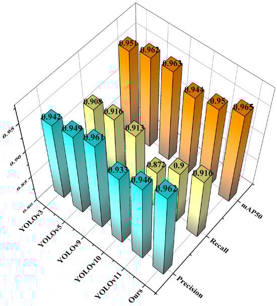 In Table 4, we first compare the GFLOPs performance across the different YOLO versions. YOLOv3 exhibits a notably high computational complexity with 282.2 GFLOPs. In contrast, YOLOv5, YOLOv9, YOLOv10, and YOLOv11 demonstrate significantly improved efficiency in terms of GFLOPs. Specifically, YOLOv5 achieves 23.8 GFLOPs, YOLOv9 requires 26.7 GFLOPs, and YOLOv10 operates at 24.4 GFLOPs. Remarkably, YOLOv11 achieves the lowest computational complexity, with only 21.3 GFLOPs. Developers have continuously optimized the network architecture throughout the iterations of the YOLO-series models, reducing computational complexity to better adapt to real-time inference and low-power device requirements. Simultaneously, as shown in Figure 9, the bar chart plotted using the training metrics from this study exhibits relatively stable fluctuations. The training results of the selected YOLO-series models on the hybrid dataset demonstrate comparable performance in terms of precision and recall, with marginal differences in mAP across models. The YOLOv9 model achieved a mAP50 of 96.3%, making it the highest-accuracy model, excluding our improved version, while YOLOv10 had the lowest mAP50 at 94.4%, differing from YOLOv9 by 1.9%. Ultimately, we selected YOLOv11 as the baseline for this study due to its lightweight design and status as the latest version. As illustrated in Figure 9 and Table 4, YOLOv11’s training results underperform other selected network architectures in all metrics except model complexity, likely because competing architectures require greater computational resources to achieve higher accuracy. However, with the improvement method proposed in Section 3 of this study, YOLOv11 achieves state-of-the-art performance across all metrics while maintaining lightweight model complexity. It establishes an optimal balance between precision and computational cost, surpassing other network architectures comprehensively [23,24,25].