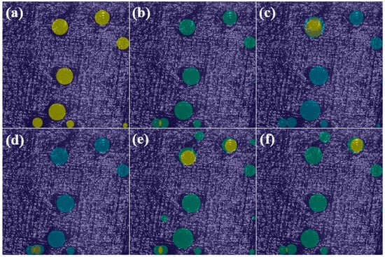 As shown in Table 5, embedding attention modules does not significantly increase parameter counts or computational costs. In comparison, the proposed C2PSA_LSKA module achieves the highest efficacy, improving mAP50 by 1.1% over the YOLOv11 baseline and by 1%, 0.8%, 15.5%, and 1.5% compared to CBAM, CA, GAM, and ECA modules, respectively. Furthermore, other attention mechanisms exhibit marginal or even degraded improvements in Precision, Recall, and mAP50-95 when compared to LSKA. For instance, integrating the CBAM module increases YOLOv11’s Precision, mAP50, and mAP50-95 by 0.6%, 0.1%, and 1.2%, respectively, but simultaneously reduces Recall by 0.07%. Consequently, the LSKA attention mechanism is selected for this study [28]. Meanwhile, Figure 10 presents the Heatmaps corresponding to various attention mechanisms evaluated in this study. The baseline YOLOv11 model without attention mechanisms fails to detect all damage precursors in the image, exhibiting missed detections (Figure 10a). Heatmaps from other attention mechanisms (Figure 10b–e) demonstrate less precise localization of damage precursors compared to the proposed LSKA (Figure 10f). This inaccuracy is most pronounced in the GAM-based results. In summary, the experimental results demonstrate that introducing the LSKA attention mechanism enhances the model’s focus on damage precursor regions while suppressing background interference. This is validated by the diffusion of network-regions interest in heatmaps generated with LSKA, which highlights its superior spatial attention allocation.