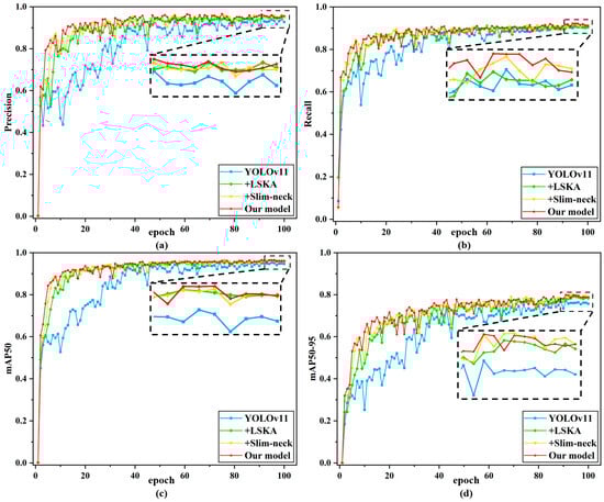 The ablation study results: (a) Precision curve; (b) Recall curve; (c) mAP50 curve; (d) mAP50-95 curve.