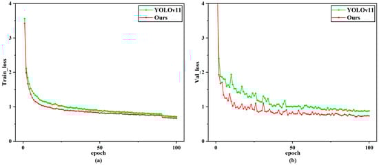 To further validate the effectiveness of the improved method on model convergence in this study, Figure 12 displays the loss convergence curves of the YOLOv11 model and our proposed model during training. By comparing the loss trajectories of both models, it is evident that the YOLOv11 model consistently exhibits higher loss values than the model proposed in this study throughout the training process. This discrepancy is most pronounced on the test set, where the loss value of YOLOv11-LSF reaches the final converged loss of the YOLOv11 model within approximately 10 epochs. Furthermore, it can be observed that the loss of the proposed model on the test set begins to stabilize around the 30th epoch, whereas the loss of YOLOv11 starts stabilizing after approximately the 45th epoch. Ultimately, the proposed model achieves training and test set loss values of 0.66538 and 0.73491, respectively, compared to the YOLOv11 model’s corresponding values of 0.70689 and 0.87955. These results conclusively demonstrate significant improvements in both stability and convergence for the enhanced model.