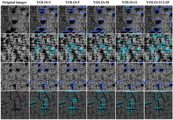 This study first compares our proposed YOLOv11-LSF network with other YOLO-series networks, including YOLOv3, YOLOv5, YOLOv9, YOLOv10, and the baseline YOLOv11, to evaluate its performance [22]. The experimental results of different models are presented in Table 4 and Figure 9.