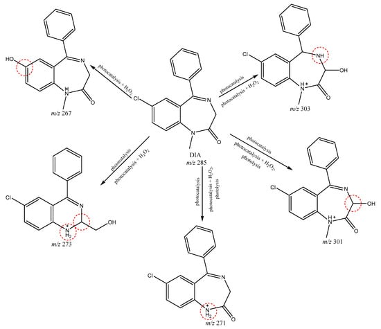 3.5. Identification of Photolytic and Photocatalytic Degradation Products of Diazepam