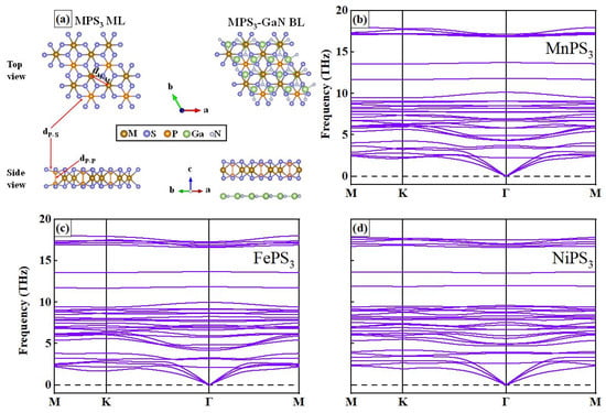 (a) The top and side view in atomic level for MPS3 MLs and vdWHs, the phonon dispersion for (b) MnPS3, (c) FePS3, and (d) NiPS3 MLs.