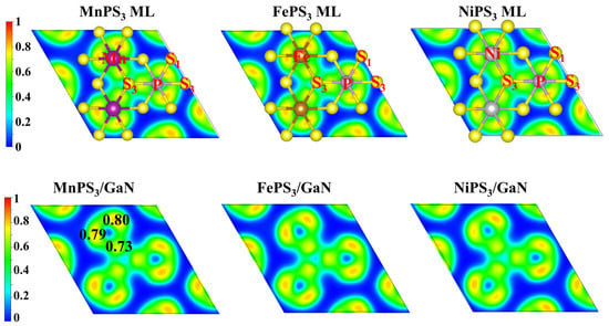 To further analyze the electron distribution within the system, we employed the Bader charge analysis method. Bader analysis is a quantitative method based on the topological structure of the electron density. It can accurately partition the charge distribution between atoms and calculate the net charge carried by each atom. Through Bader analysis, we calculated the net charges of Mn, P, S, Ga, and N atoms and observed a distinct charge transfer phenomenon. As shown in Table 1, in the MPS3 MLs, M atoms and P atoms lose electrons, while S atoms gain electrons. This indicates that electrons are transferred from M atoms and P atoms to S atoms. This further confirms the polar characteristics of the M–S and P–S bonds, and this charge transfer behavior is consistent with the covalent bond characteristics observed in the ELF analysis. As the number of outermost electrons (M-d) increases, the ability of M atoms to lose electrons weakens. It has been calculated that the numbers of electrons lost by M atoms are 1.226 |e|, 1.085 |e|, and 0.825 |e|, respectively. This observation shows that as the number of outermost electrons increases and electron-donating ability decreases, which means that the tendency of M atoms to lose electrons is reduced. The numbers of electrons lost by P atoms are 0.952 |e|, 0.927 |e|, and 0.895 |e|, respectively, while the numbers of electrons gained by S atoms are 0.731 |e|, 0.676 |e|, and 0.580 |e|, respectively. These values indicate the extent of electron transfer between phosphorus atoms and sulfur atoms in the presence of different transition metals. The changes in the number of electrons lost by P atoms reflect the regulatory effect of different transition metals on their electron-donating ability. Similarly, the differences in the number of electrons gained by S atoms indicate their interactions with transition metals and the resulting charge redistribution. In contrast, in the MPS3/GaN vdWHs, the number of electrons lost by M atoms increases, the number of electrons lost by P atoms decreases, and the number of electrons gained by S atoms remains basically unchanged. As shown in Table S1, in pure GaN ML, Ga atoms lose 1.329 |e| while N atoms gain 1.329 |e|. In vdWHs, Ga atoms lose more charge (1.492 |e|, 1.509 |e|, and 1.522 |e|), and N atoms gain more charge (1.485 |e|, 1.502 |e|, and 1.513 |e|). This indicates significant electronic interactions between GaN and MPS3 layers in vdWHs, driving further charge transfer from Ga to N. The increased charge loss of Ga and gain of N in vdWHs versus pristine GaN show strengthened interlayer interactions, which enhance charge polarization within GaN, likely related to the electronic properties of the MPS3 layer.