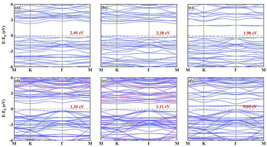 Band structure of MPS3 MLs and vdWHs: (a) MnPS3 MLs, (b) FePS3 MLs, (c) NiPS3 MLs, (d) MnPS3/GaN vdWs, (e) FePS3/GaN vdWs, and (f) NiPS3/GaN vdWs. The fermi level (EF) is marked in dashed lines. The bandgaps are listed in the corresponding pictures. The pink and blue lines represent the spin-up and spin-down channels, respectively.