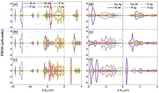 The projected density of states (PDOS) of MPS3 MLs and vdWHs: (a) MnPS3 ML, (b) FePS3 ML, (c) NiPS3 ML, (d) MnPS3/GaN vdWs, (e) FePS3/GaN vdWs, and (f) NiPS3/GaN vdWs. The Fermi level (EF) is marked in dashed lines.