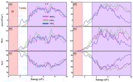 Calculated spectra of the (a) adsorption α(ω), (b) reflection R(ω), and (c) transmission T(ω) coefficients of MPS3 MLs and (d–f) for MPS3/GaN vdWHs.