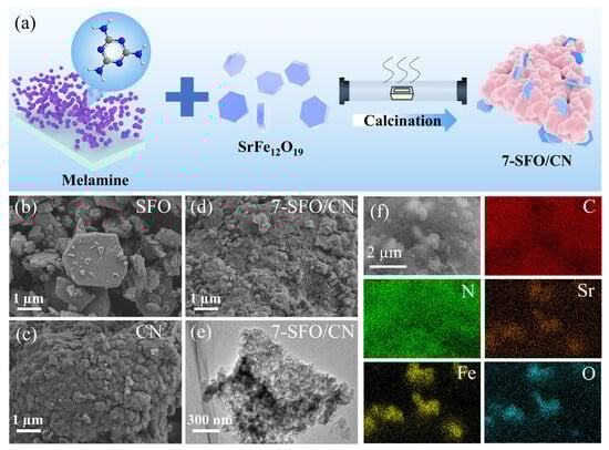 (a) The preparation process of SrFe12O19/g-C3N4 composite. The SEM images of (b) SFO, (c) CN, and (d) 7-SFO/CN. (e) The TEM images of 7-SFO/CN. (f) The SEM-EDS mapping of 7-SFO/CN.