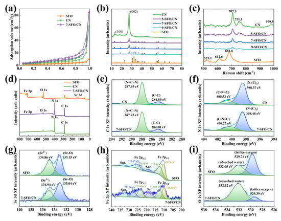 (a) N2 adsorption-desorption curves of SFO, CN, and 7-SFO/CN. (b) The XRD patterns and (c) Raman spectroscopy of SFO, CN, and SrFe12O19/g-C3N4 composites. (d) Survey XPS and high-resolution XPS spectra of (e) C 1s, (f) N 1s, (g) Sr 3d, (h) Fe 2p, and (i) O 1s of SFO, CN, and 7-SFO/CN.