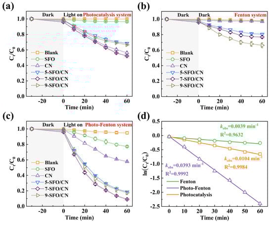 The degradation efficiency of OTC in the (a) photocatalysis system, (b) Fenton system, and (c) photo-Fenton system. (d) The rate constants (kobs) of 7-SFO/CN in different systems. Experimental parameters: [OTC] = 10 mg/L, [Catalyst] = 0.25 g/L, [H2O2] = 0.1 mL.