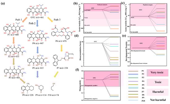 (a) Possible degradation pathways of OTC in the photo-Fenton system. (b) Fathead minnow LC50 (96 h), (c) daphnia magna LC50 (48 h), (d) bioaccumulation, (e) developmental toxicity, and (f) mutagenicity of OTC and its intermediate degradation.