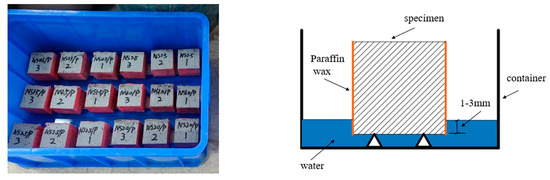 The capillary absorption test in this study adhered to the specifications of ASTM C1585-13. Standard cubic specimens (Figure 2) with dimensions of 70.7 mm × 70.7 mm × 70.7 mm were used, and the test was conducted in an environment with a controlled temperature of 20 ± 2 °C. After curing in a standard curing room for 28 days, the specimens were placed in an oven at 80 ± 5 °C for 48 h. Upon removal from the oven, prepared paraffin wax was heated to a liquid state and evenly applied to all four side-surfaces of the cubes. This ensured one-dimensional capillary absorption during the test and prevented water ingress from the sides. After sealing the specimen, it was allowed to stand for 20 min until the wax was completely solidified. The weight of the specimen was measured as using an electronic scale. The experimental setup consisted of a support platform placed at the bottom of a container. Tap water was added until the liquid level reached 1–3 mm above the platform’s upper surface. The specimen was then carefully positioned with its testing surface in contact with the platform, and the timer was immediately started (Figure 1). Capillary absorption measurements were recorded at 5, 10, 20, 30, 60, 120, 180, 360, and 720 min. At each interval, the specimen was removed, gently wiped with a soft cloth, inverted, and weighed, yielding . The capillary absorption was calculated using Equation (1):