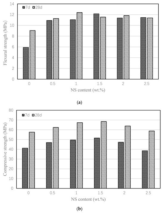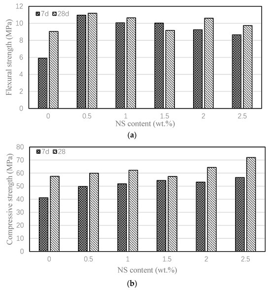 Effect of NS on the flexural and compressive strengths of various mortars. (a) Flexural strengths; (b) Compressive strengths.