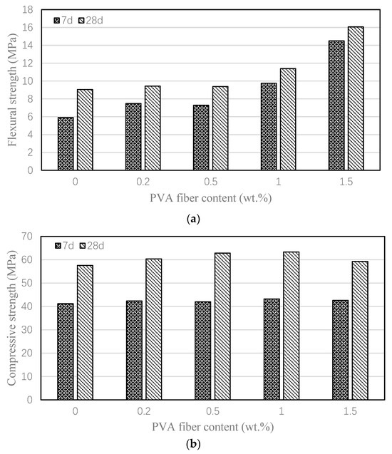 Effect of PVA fiber on the flexural and compressive strengths of various mortars. (a) Flexural strengths; (b) compressive strengths.