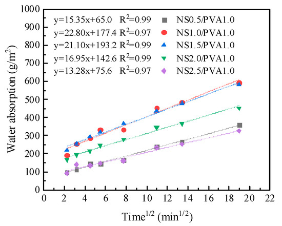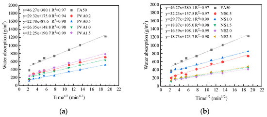 Figure 7 and Figure 8 show the capillary water absorption test results, where the unit area water absorption is plotted against the square root of time. The slope of the curves is obtained through linear regression, which is also shown in the figures. The slope represents the early capillary absorption rate of cement-based composite materials, as shown in Equation (3).