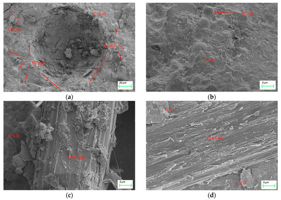Figure 11d presents the internal morphology of a mortar with a combined addition of 2.0% NS and 1.0% PVA fiber. It can be observed that the PVA fibers are closely integrated with the surrounding cementitious matrix, and there is hardly any visible interface between the PVA fibers and the cementitious matrix. They are almost perfectly bonded, allowing the PVA fibers to restrict the formation and development of cracks effectively. This integration significantly enhances mortar strength and effectively reduces shrinkage changes.