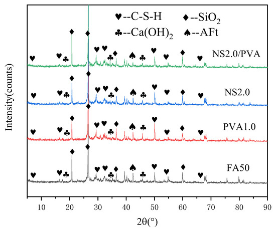 Figure 12 displays the XRD patterns of the mortar specimens, revealing their characteristic hydration products and their relative quantities. Distinct calcium silicate hydrate (C-S-H) diffraction peaks are observed at 2θ angles of 7°, 16°, 29°, 32°, 49°, 54°, 60°, and 66° [56,57]. Notably, the NS2.0 and NS2.0/PVA modified mortars exhibit significantly enhanced peak intensities at 29° and 49° compared to conventional fly ash mortar, demonstrating that NS effectively accelerates the hydration reactions between fly ash and cement, thereby promoting additional C-S-H formation.