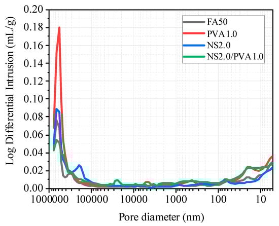 The results of the mercury intrusion test are shown in Figure 13. The pore structure analysis reveals distinct characteristics among different mortar compositions. Plain fly ash mortar exhibits a relatively high volume of macropores. Interestingly, the addition of PVA fibers leads to increased overall porosity and macropore content, with particularly notable growth in the population of detrimental pores exceeding 400 μm in diameter—significantly higher than observed in the reference fly ash mortar. In contrast, NS demonstrates an effective pore refinement capability in fly ash mortar systems. When incorporated into PVA fiber-reinforced mortar, NS produces two notable effects: a substantial reduction in macropore quantity and a marked increase in smaller pores, especially those below 100 nm in diameter. This microstructural modification suggests that NS promotes pore structure refinement through both pozzolanic reaction and physical filling effects. Compared to ordinary fly ash mortar, the NS2.0/PVA1.0 group showed a reduction in macropore quantity and an increase in small pore quantity, effectively improving the internal pore structure of the mortar. Combined with the results from the micro-scanning electron microscope (Figure 11) and the mechanical performance and drying shrinkage tests, the incorporation of NS and PVA fibers significantly enhanced the mechanical properties of fly ash mortar, reduced water absorption, and lowered the drying shrinkage rate.