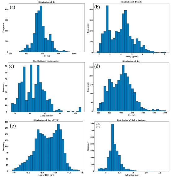 Data distribution of six properties of oxyfluoride glass, (a) glass transition temperature, (b) density, (c) Abbe number, (d) liquidus temperature, (e) thermal expansion coefficient after taking logarithmic values, (f) refractive index.